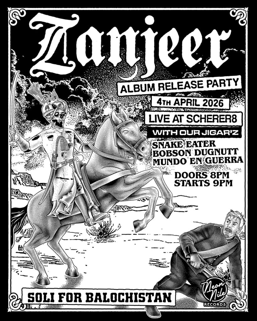 Berlin hardcore punk band ZANJEER returns with Seher-e-Maqhoor (Eng: Dawn of the Oppressed), via NEON NILE RECORDS on LP, CD, and tape.